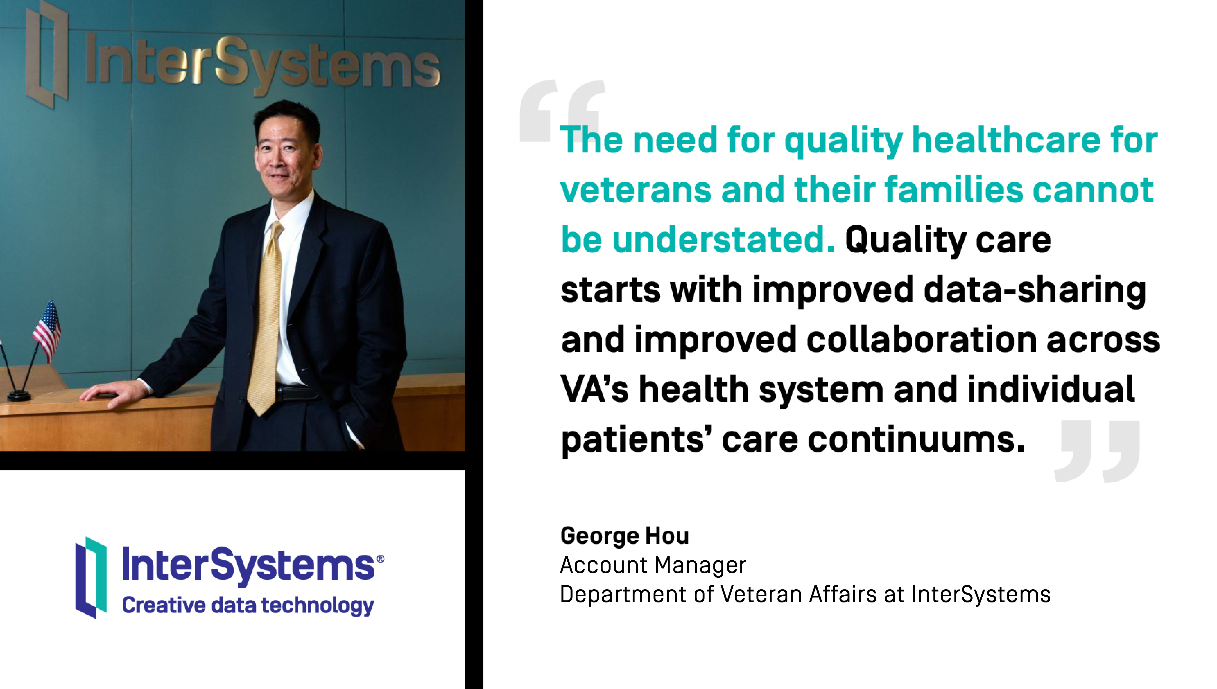 “The need for quality healthcare for veterans and their families cannot be understated,” said George Hou, Head of Solutions for the Department of Veteran Affairs at InterSystems. “Quality care starts with improved data-sharing and improved collaboration across VA’s health system and individual patients’ care continuums. This award is a testament to the profound impact these solutions have on delivering the right care and decision-making information to veterans and their care providers at every step of the health journey.”