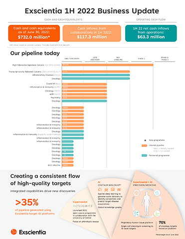 A continuación se resumen los últimos avances en la línea de producción, las colaboraciones y las operaciones de la empresa, así como los resultados financieros del segundo trimestre y el primer semestre de 2022. Además, Exscientia organizará una rueda de prensa telefónica el jueves 18 de agosto a las 14:30 (hora peninsular española) para ofrecer una visión general de la cartera de productos en desarrollo y la estrategia corporativa de la empresa.