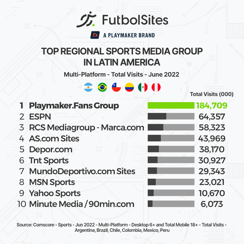 TORONTO--(BUSINESS WIRE)--Playmaker Capital Inc.(TSXV: PMKR) (“Playmaker”), a empresa digital de mídias esportivas que oferece experiências únicas de conteúdo através de sua carteira de mídias esportivas e marcas de tecnologia, ficou no primeiro lugar do ranking de grupos de mídias esportivas digitais nos principais mercados da América Latina (Brasil, México, Argentina, Colômbia, Chile e Peru), conforme os dados de junho oferecidos pela Comscore, referência global em planejamento, transações e avaliações de mídias digitais.