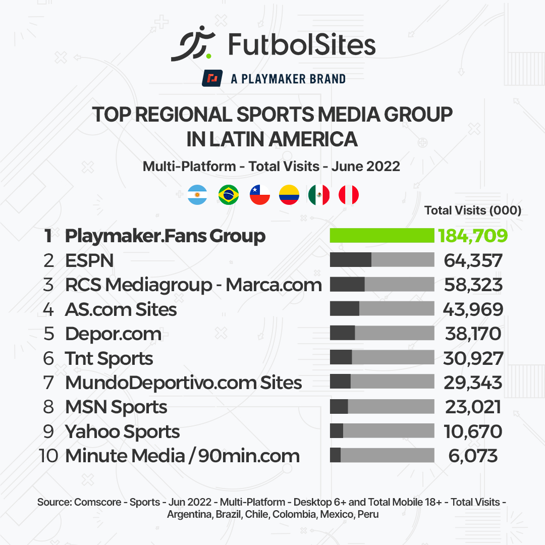 Segundo os rankings de junho em destaque pela Comscore, Playmaker é o grupo de mídias esportivas número um em toda a região. Além disso, o Bolavip continua no topo da liderança de páginas web.