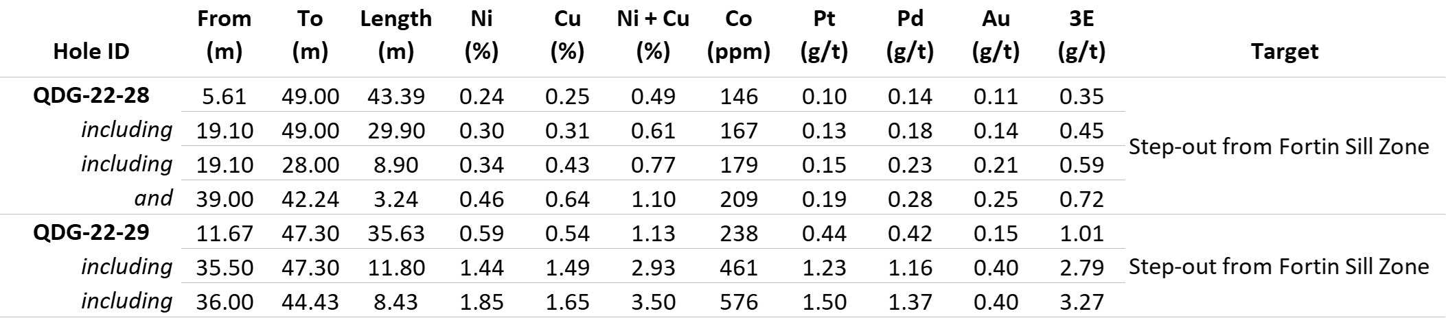 - Im Bohrloch QDG-22-28 wurde ein 29,90 Meter langer Abschnitt mit durchschnittlich 0,30% Ni, 0,31% Cu, 167 ppm Co und 0,45 g/t Pt-Pd-Au durchteuft, der einen Teilabschnitt mit einem höheren Gehalt von 0,46% Ni, 0,64% Cu, 209 ppm Co und 0,72 g/t Pt-Pd-Au auf 3,24 Metern enthält.