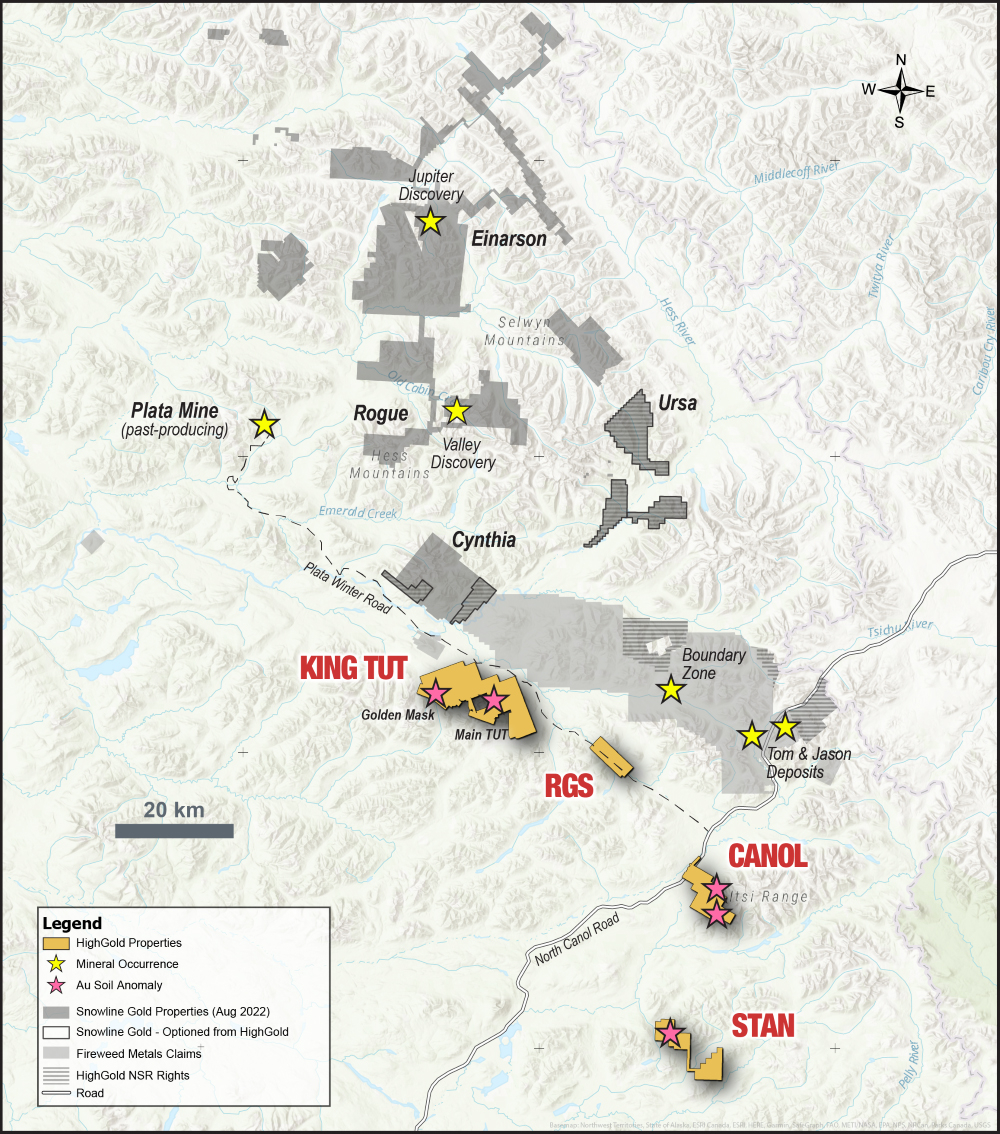 HighGold acquired its initial 50% interest in the Properties during the Company’s formation through the Plan of Arrangement ‘spin-out’ from Constantine in 2019. Over the last three years, portions of the large property package were optioned off to Fireweed Zinc and Snowline Gold Corp. with HighGold receiving certain NSR royalty rights and shares of each company. The purchase agreement announced today provides HighGold with 100% ownership of the remaining properties held under the original joint venture, highlighted by the King Tut property that is host to the biggest and best soil anomaly of the portfolio. The four properties included in the purchase agreement, King Tut, Canol, Stan and RGS are all located within reasonable proximity to the North Canol road.