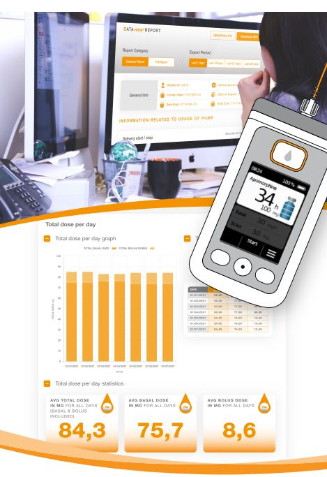 Grâce à cet outil, les données historiques de la pompe D-mine® peuvent être converties en un rapport pratique par les professionnels de la santé qui supervisent le traitement des patients atteints de la maladie de Parkinson par perfusion sur des appareils Windows ou macOS. Les paramètres du dispositif, tels que les doses délivrées, les débits et les réglages de temps, sont affichés dans des tableaux et des graphiques faciles à lire au format PDF.