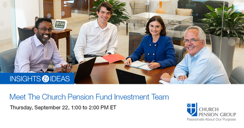 NEW YORK--(BUSINESS WIRE)--The Church Pension Group (CPG), a financial services organization that serves The Episcopal Church, announced that it will host a virtual conversation with members of The Church Pension Fund Investment Team to discuss their backgrounds and responsibilities, their long-term investment strategies, and how they approach their work. Individuals interested in attending the event, which will take place on Thursday, September 22, 2022, from 12:00 PM to 1:00 PM ET, can register at cpg.org/Insights&Ideas.