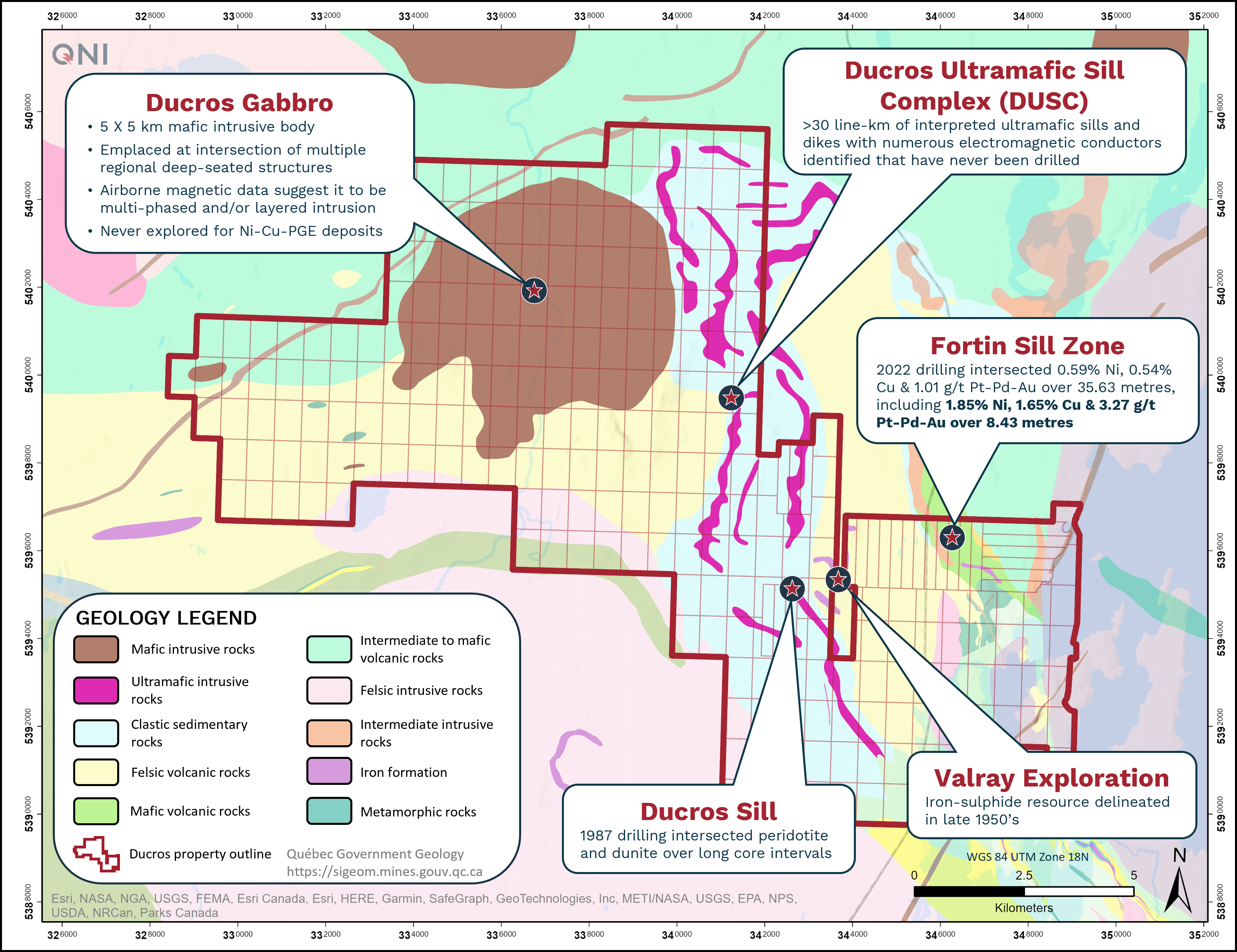 Der DUSC umfasst ein etwa 2 Kilometer breites und ~10 Kilometer langes Areal, das mutmaßlich von beträchtlichen Mengen ultramafischer und mafischer Erzgänge und Schwellen unterlagert wird, die in einem großen Vorkommen von sulfidhaltigen klastischen Metasedimenten eingebettet sind (Abbildungen 1 und 2). Da das Zielgebiet von unterschiedlich dicken Ablagerungen bedeckt ist und nur wenige bis keine Aufschlüsse aufweist, basiert die aktuelle geologische Einschätzung des Ducros-Grundstücks auf geologischen Karten der Regierung von Québec, die wiederum auf der Interpretation historischer geophysikalischer Luftbilddaten beruhen.