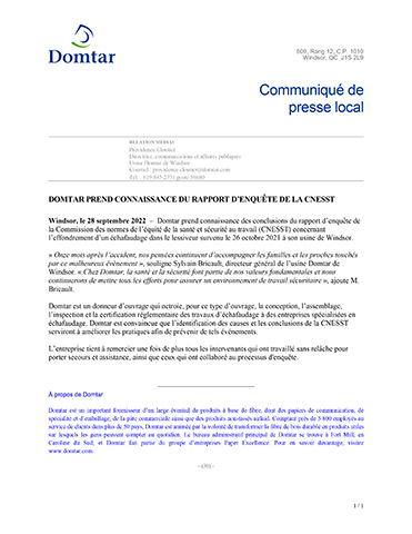 WINDSOR, Ontario--(BUSINESS WIRE)--Domtar prend connaissance des conclusions du rapport d’enquête de la Commission des normes de l’équité de la santé et sécurité au travail (CNESST) concernant l’effondrement d’un échafaudage dans le lessiveur survenu le 26 octobre 2021 à son usine de Windsor.
