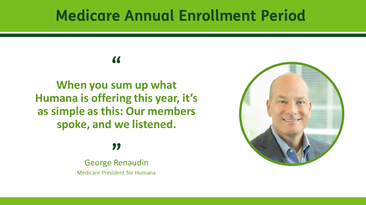 “Cuando uno suma lo que Humana ofrece este año, es tan simple como esto: Nuestros afiliados opinaron y nosotros escuchamos”, manifestó George Renaudin, presidente de Medicare para Humana. “Realizamos extensas investigaciones para garantizar que nuestros cambios se alinean con lo que quiere y necesita el consumidor. Esta investigación dio como resultado inversiones enfocadas en lo que quiere el consumidor, por ejemplo, cobertura dental, que es sistemáticamente una prioridad núm. 1, en los beneficios complementarios para nuestros afiliados”.