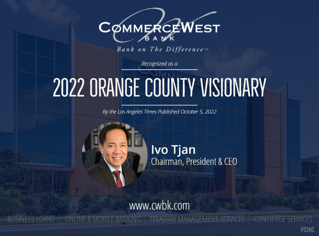 IRVINE, Calif.--(BUSINESS WIRE)--Ivo Tjan, Chairman, President and CEO of CommerceWest Bank (OTCQX: CWBK) was recognized by the Los Angeles Times as a 2022 Orange County Visionary in acknowledgement for his noteworthy success to the business community during the last 18 months.