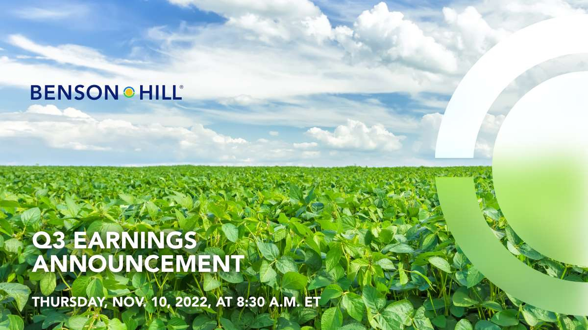 ST. LOUIS--(BUSINESS WIRE)--Benson Hill, Inc. (NYSE: BHIL, the “Company” or “Benson Hill”), a food tech company unlocking the natural genetic diversity of plants, announced today that it will release its financial results for the third quarter for the period ending Sept. 30, 2022, before the market opens on Thursday, Nov. 10, 2022.