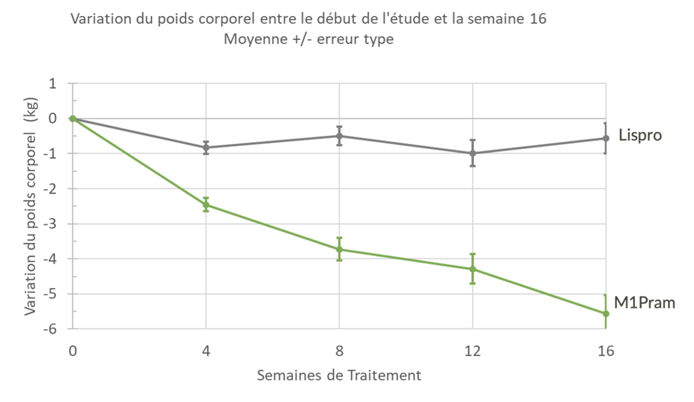 TOUT EN ENTRAINANT UNE PERTE DE POIDS, M1PRAM OFFRE UN CONTRÔLE GLYCÉMIQUE ÉQUIVALENT À CELUI DE L’INSULINE PRANDIALE DE RÉFÉRENCE