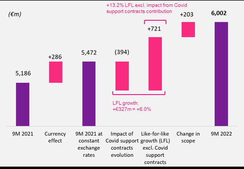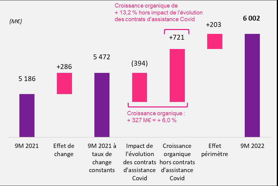 La croissance organique enregistrée au cours des 9 premiers mois 2022 a été particulièrement soutenue au regard de l’impact de la baisse de contribution des contrats d’assistance Covid en 2022 par rapport à 2021 (- 394 millions d’euros sur 9 mois). Retraitée de cet impact non récurrent et attendu, la croissance organique s’établit à + 13,2 %.