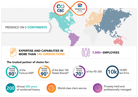 WILMINGTON, Del.--(BUSINESS WIRE)--CSC heeft vandaag aangekondigd dat het de overname van Intertrust Group zal voltooien, zoals nader uiteengezet in het gezamenlijke persbericht van CSC en Intertrust Group. De overname markeert een belangrijke mijlpaal voor CSC, dat nu zaken zal doen met meer dan 90% van de Fortune 500®, meer dan 90% van de 100 Best Global Brands® en meer dan 70% van de PEI 300. Rod Ward III, die een directe afstammeling is van een van de twee oprichters van het bedrijf en bijna 13 jaar president en CEO van CSC is geweest, zal de gecombineerde organisatie leiden. Een zeer ervaren Enterprise Leadership Team, waaronder de CEO van Intertrust Group, Shankar Iyer, zal Ward ondersteunen.