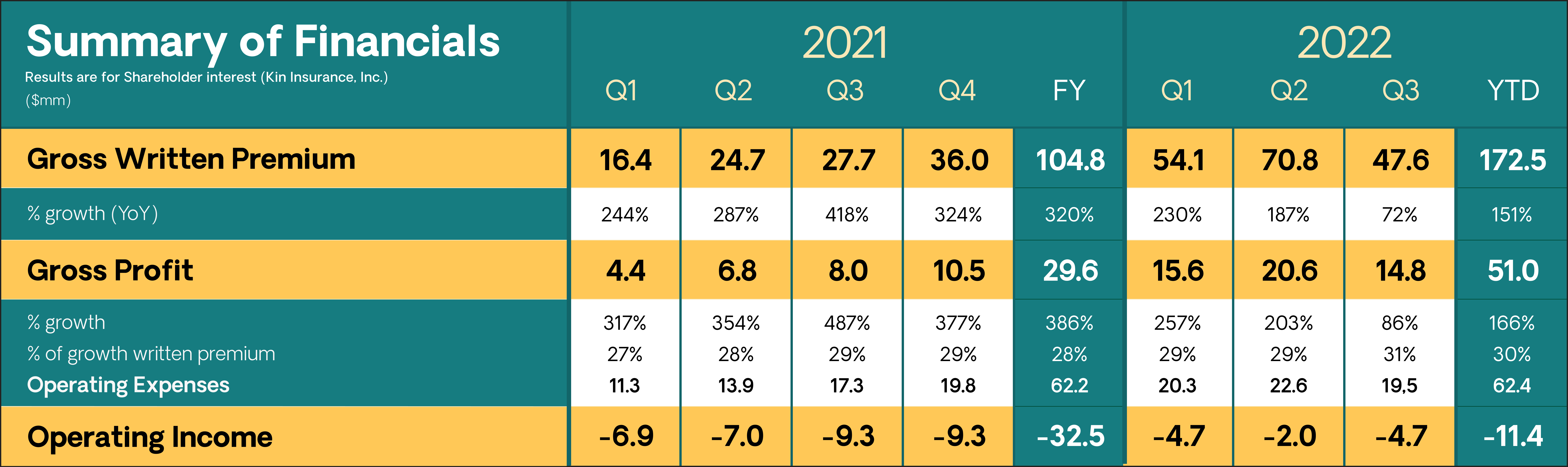 - Kin finished the third quarter of 2022 with $47.6 million in Gross Written Premium, 72% above the prior-year period.