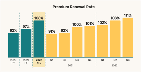 - Premium Renewal Rate on the Kin Interinsurance Network (the “Carrier”), a reciprocal exchange managed by Kin Insurance, Inc., increased to 111% in the third quarter of 2022, bringing the year-to-date Premium Renewal Rate to 108%.