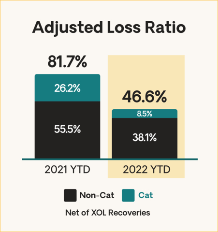 Through the third quarter of 2022, Kin’s adjusted loss ratio, net of XOL recoveries, decreased to 46.6% from 81.7% in the prior-year period. Non-CAT adjusted loss ratio was 38.1% through the third quarter of 2022, and has decreased on an inception basis each of the last seven quarters.