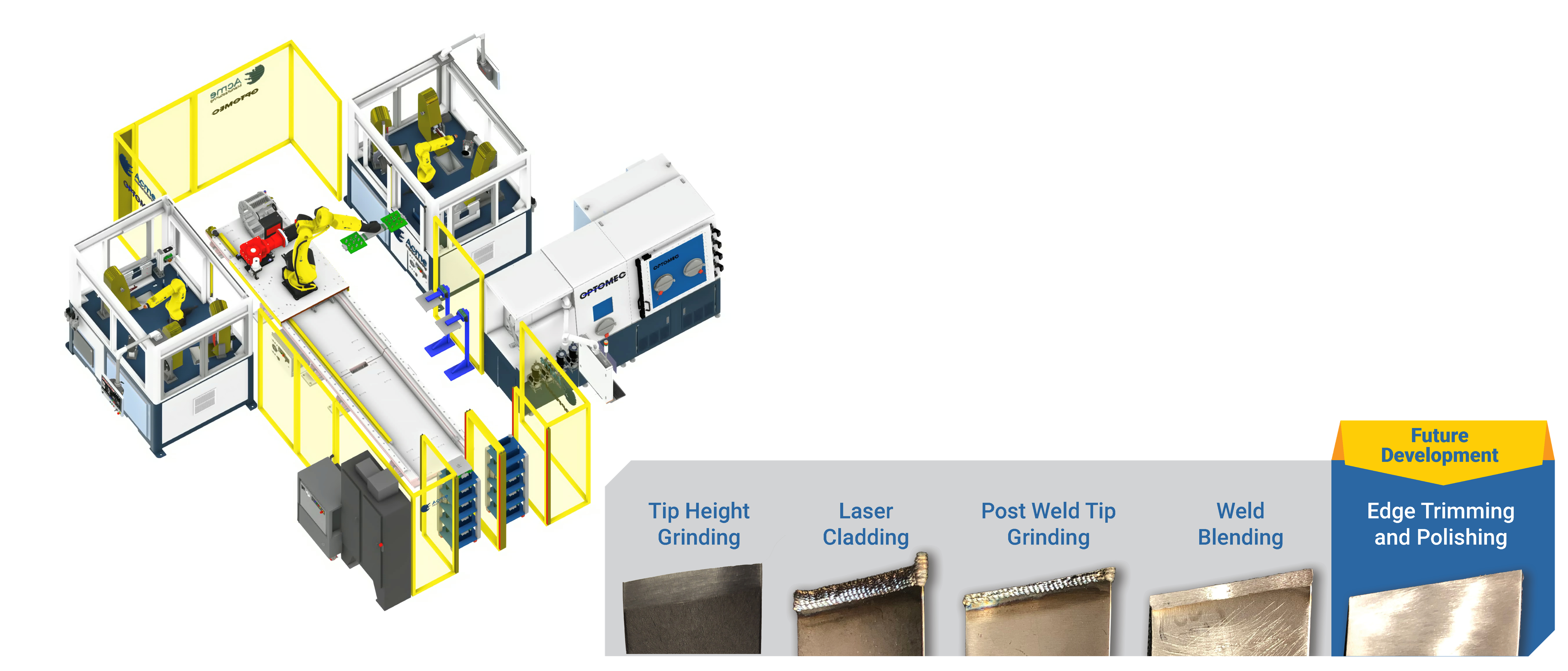 The entry level work cell consists of three stations that enable robotic blade tip grinding, 3D additive laser cladding and robotic post clad finishing. The cell also includes an automated pallet load/unload station, a unique pallet flipping station, and a robotic material handling system. Each machine in the work cell is capable of automatically adjusting tool paths to accommodate blade-to-blade variations resulting from normal wear and distortion during service. The Optomec CS-250 5-axis laser cladding machine is used to produce high quality, high yield precision welds for titanium compressor blades utilizing proprietary LENS Directed Energy Deposition (DED) and AutoCLAD advanced vision and adaptive tool-pathing technology in a controlled argon atmosphere. The Acme Manufacturing MRO blade tip repair machines can be configured for blade tip grinding, weld blending, and polishing. The system is equipped with the first of its kind auto path generation, that allows for a high mix, low volume environment. This new technology is 3X to 4X faster than traditional CNC machines.