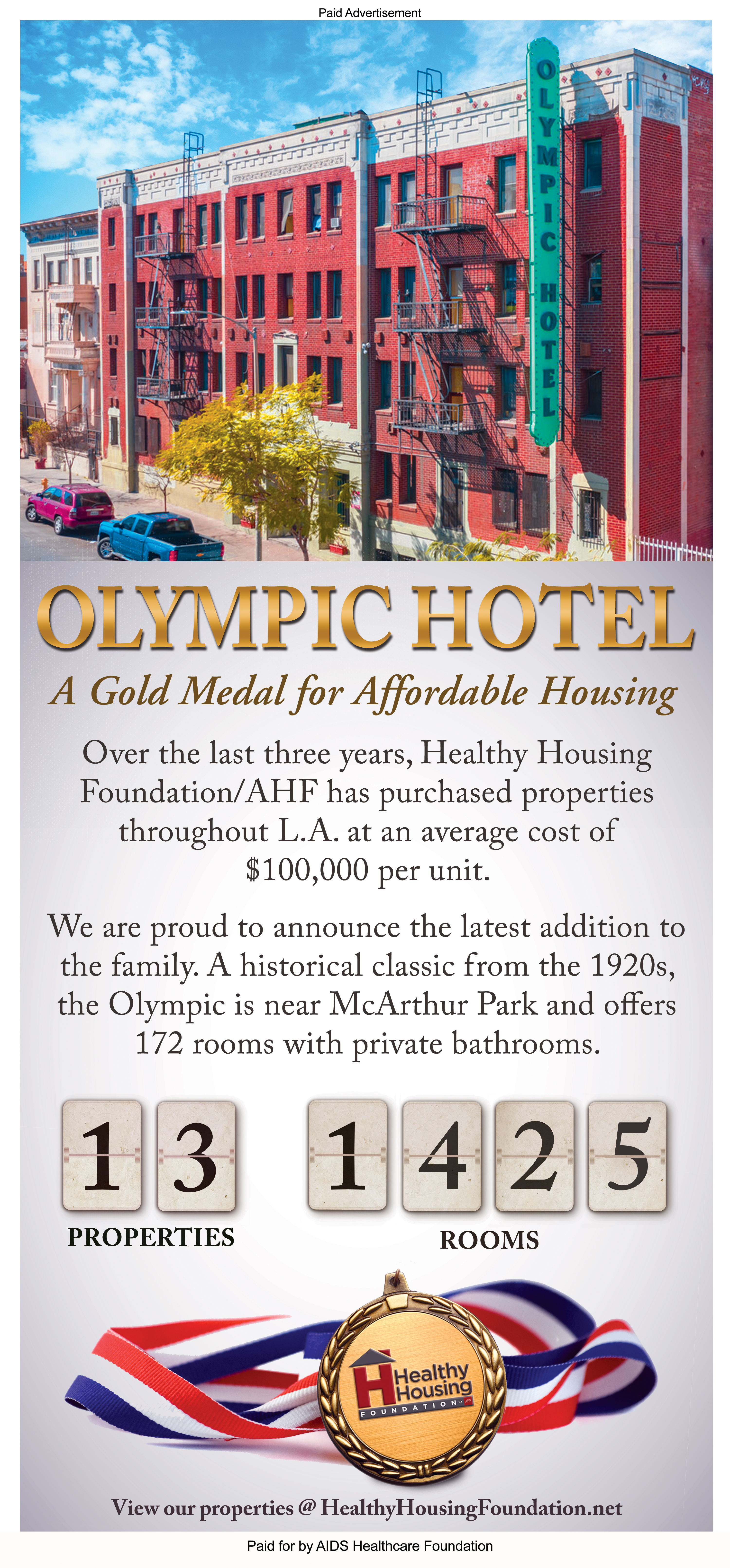 LOS ANGELES--(BUSINESS WIRE)--AHF will run another full-page, full-color housing advocacy ad set to be published this Sunday, November 13th in the Los Angeles Times. The ad, headlined “Olympic Hotel-A Gold Medal for Affordable Housing”, highlights AHF’s latest hotel acquisition for its Healthy Housing Foundation, the 172-room Olympic Hotel near MacArthur Park.