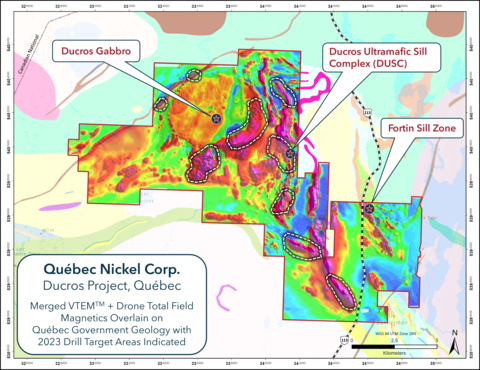 Figure 1. Plan map of Québec Nickel’s Ducros property (red outline) showing the merged total field VTEMTM and drone magnetic data sets overlain on top of Québec Government geology. 2023 drilling target areas are indicated by dashed outlines. Drill targets comprise coincident geophysical anomalies (VTEM conductive features +/- magnetic highs responses +/- gravity features). (Graphic: Business Wire)