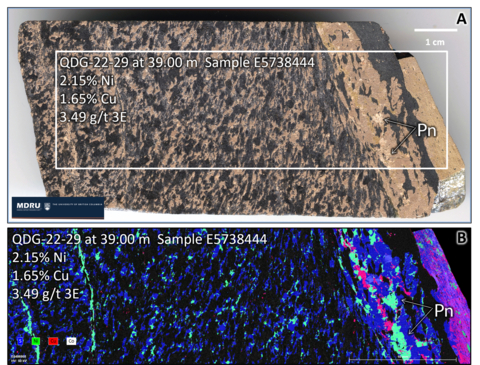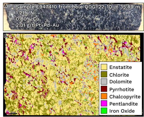 Le forage dans la zone du filon-couche de Fortin ainsi que la zone immédiate se poursuit à l'aide de deux foreuses de surface. L'accent est mis sur les extensions interprétées de la zone nickel-cuivre-éléments du groupe de platine (PGE), évaluant de nombreuses anomalies géophysiques possédant une expression similaire à celle de la zone du filon-couche de Fortin, et explorant le système minéralisé en profondeur. Comme nous l'avions précédemment indiqué, un second forage a été réalisé dans le cadre du programme de forage en octobre suite au succès du forage de la Société, y compris une recoupe de 8,43 mètres de long de 1,85% de Ni, 1,65% de Cu (3,50% Ni + Cu), 576 ppm Co et 3,27 g/t Pt-Pd-Au dans le cadre d'un forage complémentaire dans le trou QDG-22-29 (voir le communiqué de presse du 30 août 2022). La description et l'échantillonnage des carottes de forage sont en cours et les résultats sont attendus sous peu pour plus de 50% des échantillons soumis au laboratoire d'analyses pour cette phase du travail.