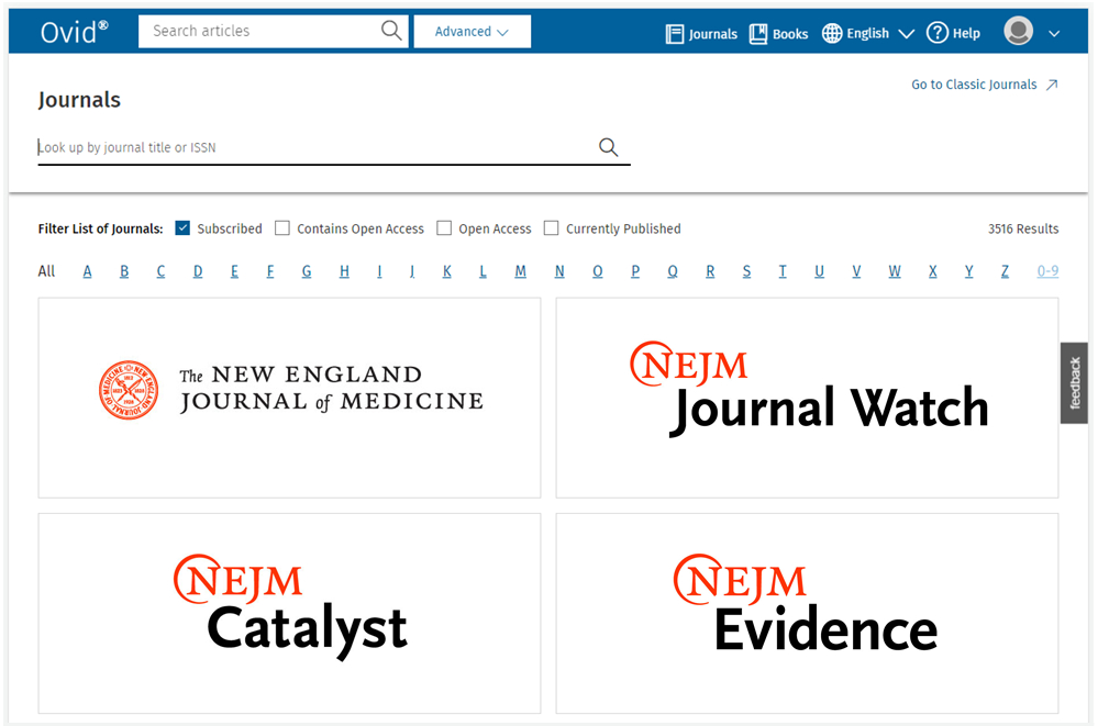 Door de samenwerking hebben institutionele online abonnees op tijdschriften van de NEJM Group toegang tot hun abonnee-inhoud zowel via de sites van de NEJM Group als via het medische onderzoeksplatform Ovid®. Ovid omvat meer dan 150 uitgevers en meer dan 100 specialismen en dient als de krachtige, allesomvattende onderzoekssoftware om onderzoekers, bibliothecarissen, clinici en andere zorgprofessionals te helpen tijdige en relevante medische informatie te vinden om cruciale beslissingen te nemen teneinde de patiëntenzorg te verbeteren, lopend onderzoek te versterken en voor nieuwe ontdekkingen te zorgen. Met de toevoeging van NEJM Group-titels kunnen Ovid-gebruikers zoeken naar en toegang krijgen tot het beste onderzoek en informatie op het snijvlak van biomedische wetenschap en klinische praktijk, ter ondersteuning van verbeterde patiëntenzorg en klinische resultaten.