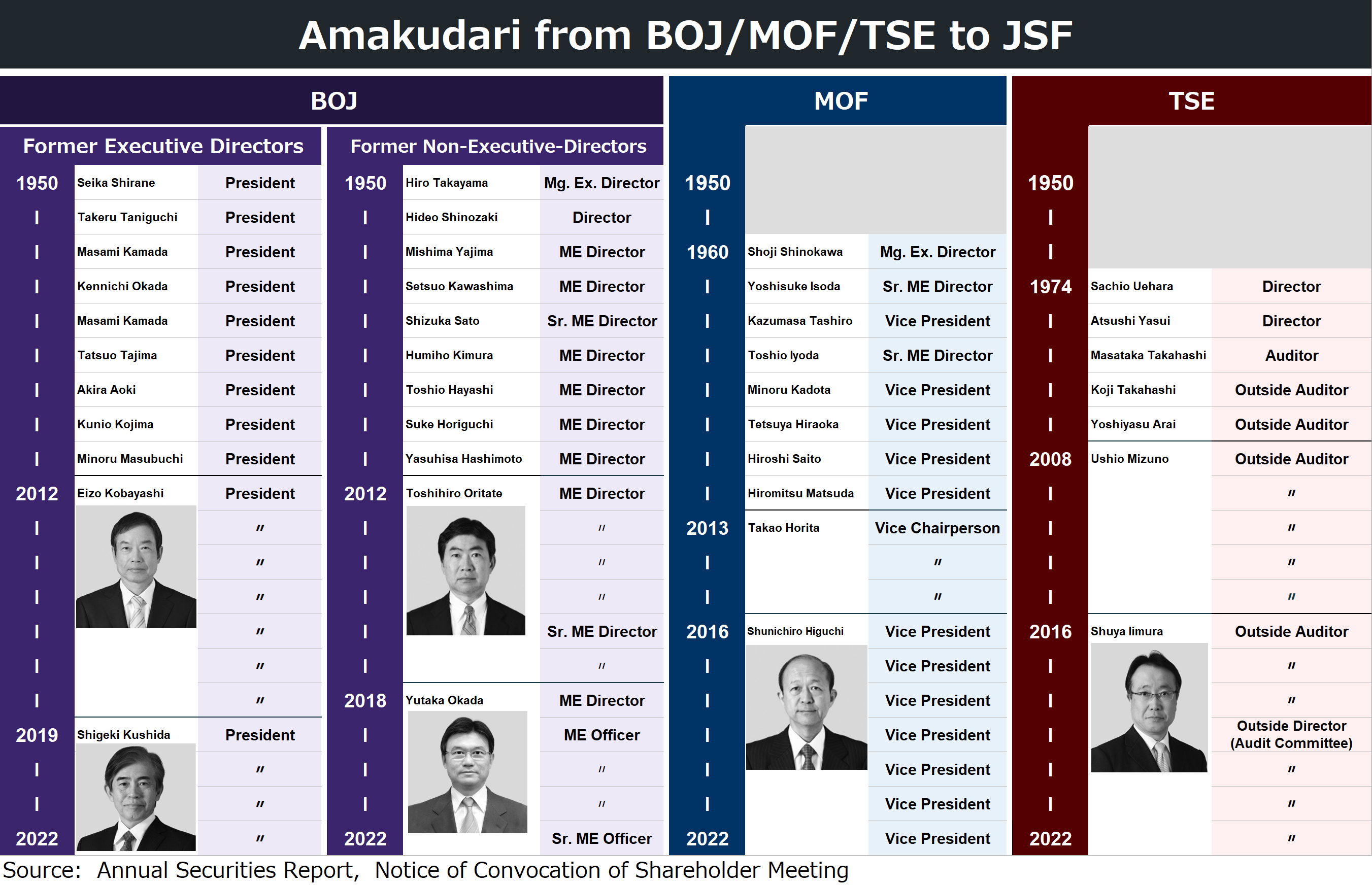 自從JSF在東京證券交易所(TSE)上市以來,日本銀行(BOJ)、財務省(MOF)和東京證券交易所一直將JSF的董事和高階主管職位作為空降(amakudari)1目的地。因此,我們決定召集臨時股東大會(EGM),因為我們認為,從ESG(環境、社會與治理)的S(社會)和G(治理)的角度來看,空降正在損害JSF的股東價值。