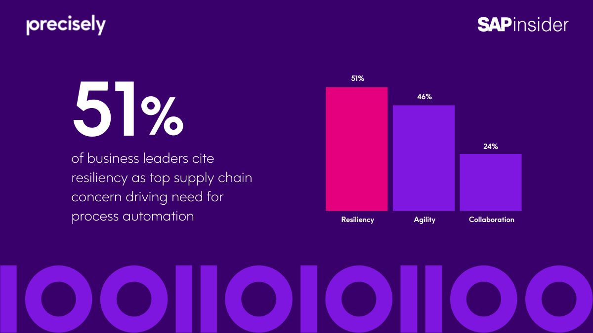 BURLINGTON, Mass.--(BUSINESS WIRE)--Precisely, de wereldleider op het gebied van data-integriteit, heeft vandaag in samenwerking met SAPinsider de resultaten bekendgemaakt van nieuw wereldwijd onderzoek dat het belang van procesautomatisering bij het bouwen van robuuste toeleveringsketens benadrukt. Bevindingen uit het nieuwe benchmarkrapport, Process Automation in Supply Chain, laten zien dat 51% van de respondenten veerkracht noemt als de belangrijkste zorg voor de toeleveringsketen die de behoefte aan procesautomatisering stimuleert, met wendbaarheid op korte afstand met 46%. Een achtergrond van ontwrichtende wereldgebeurtenissen betekent dat bedrijven steeds meer strijden tegen wereldwijde verstoring van de toeleveringsketen, evenals toenemende druk om gelijke tred te houden met de veranderende voorkeuren van consumenten voor digitale, lokale en duurzame goederen, wat resulteert in een dringende behoefte aan transformatie van de toeleveringsketen.
