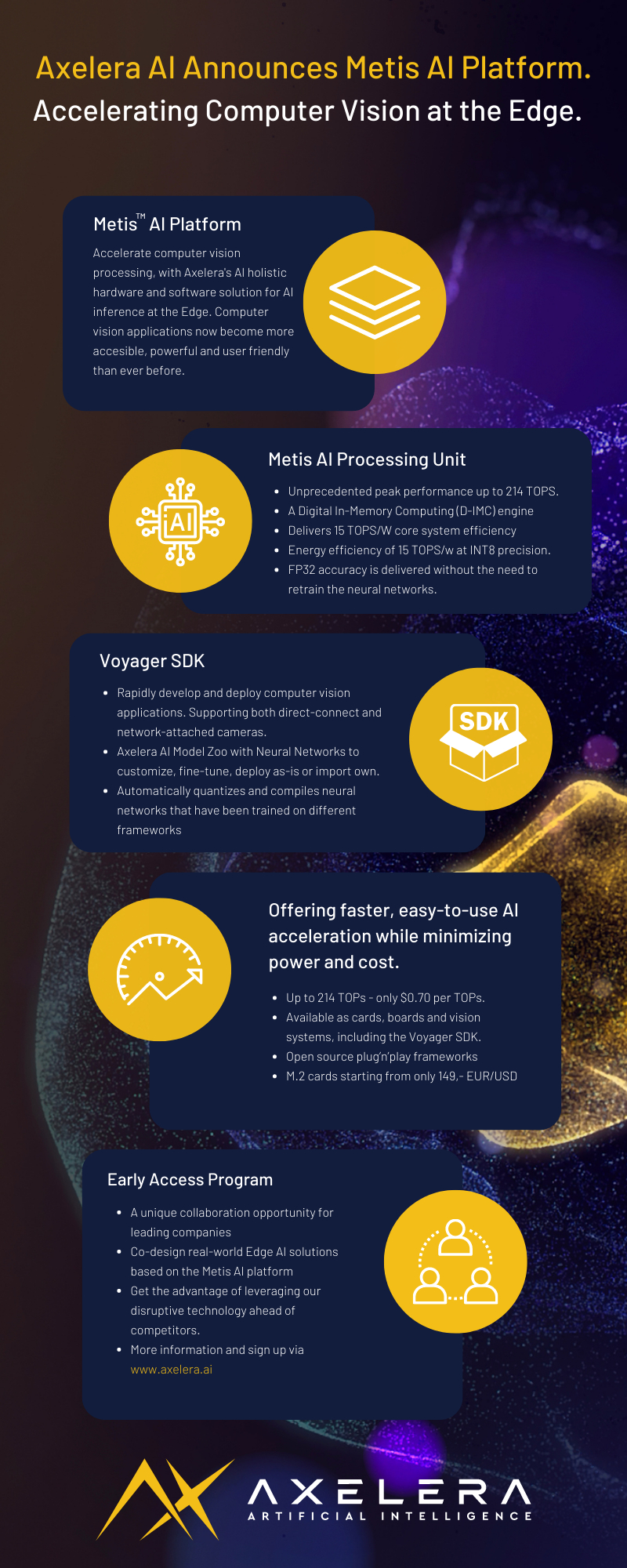 EINDHOVEN, Nederland--(BUSINESS WIRE)--De Europese startup voor kunstmatige intelligentie (AI) Axelera AI heeft vandaag haar Metis AI-platform aangekondigd, dat de MetisTM AI Processing Unit (AIPU)-chip en de VoyagerTM SDK-softwarestack omvat – beschikbaar als kaarten, borden en visie systemen – om computervisieverwerking aan de rand te versnellen.