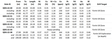 Untersuchungsergebnisse werden auch für das Bohrloch QDG-22-38 berichtet, welches an der nordöstlichen Seite des Aufschlusses der Fortin Sill Zone gebohrt wurde und in Richtung Südwesten unter der Grundgesteinsbelastung niedergebracht wurde. Die Geologie und die Mineralisierung, die in diesem Bohrloch angetroffen wurden, sind in der Pressemitteilung des Unternehmens vom 19. Oktober 2022 zusammengefasst; eine Zusammenfassung der Untersuchungsergebnisse wird nachfolgend in Tabelle 1 zur Verfügung gestellt. Das Vorkommen einer stark anomalen Ni-Cu-Co-PGE-Au-Mineralisierung weit unterhalb der Fortin Sill Zone in QDG-22-38 unterstreicht das Potenzial für die Entdeckung weiterer Ni-Cu-Co-PGE-Au-Mineralisierungen in der Tiefe und im gesamten größeren Zielgebiet der Fortin Sill Zone. Wie in der Pressemitteilung des Unternehmens vom 19. Oktober 2022 beschrieben, wurde eine Reihe von Bohrlöchern von einem bestehenden Bohrplatz im Südwesten der Fortin Sill Zone aus gebohrt, um die Kontinuität dieser tieferen Mineralisierung zu testen; die Ergebnisse dieser Bohrungen stehen noch aus.