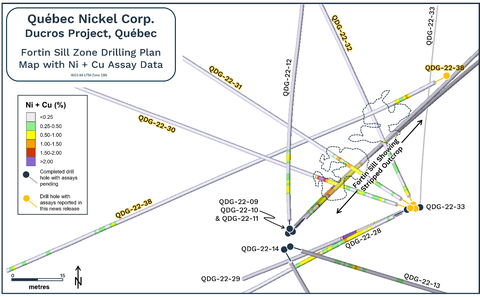 VANCOUVER, British Columbia--(BUSINESS WIRE)--Québec Nickel Corp. (CSE: QNI; FSE: 7lB; OTCQB: QNICF) („QNI“ oder das „Unternehmen“) freut sich, über weitere Untersuchungsergebnisse von Bohrungen auf seinem Ni-Cu-Co-PGE-Au-Projekt Ducros, 80 Kilometer nordöstlich von Val-d'Or, Québec, zu berichten. Die Untersuchungsergebnisse werden hier für vier Bohrungen berichtet, die in der Fortin Sill Zone abgeschlossen wurden und zeigen, dass sich die Zone vom mineralisierten Oberflächenaufschluss in Richtung Südosten erstreckt. Darüber hinaus zeigen die Untersuchungsergebnisse auch das Potenzial für die Entdeckung weiterer Fortin Sill Zone-ähnlicher Vorkommen in der Tiefe.