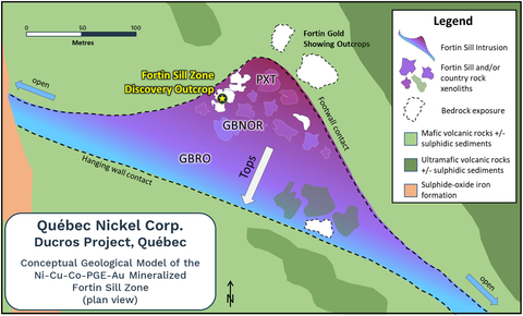 Une analyse de toutes les données recueillies à la propriété Ducros cette année a permis d'obtenir un modèle géologique/d'exploration élaboré pour la zone Fortin Sill (Figure 2). Un examen et une intégration des données géophysiques pertinentes (VTEMTM, mesures magnétiques par drone, gravité aéroportée), et des résultats historiques et de forage de QNI, ainsi que d'une récente cartographie géologique, indiquent que la minéralisation Ni-Cu-Co-PGE-Au à la zone Fortin Sill se produit à, ou à proximité de, l'éponte inférieure d'une large structure d'enfoncement s'abaissant dans une direction ouest-sud-ouest dans la zone mafique et ultramafique élargie de Fortin Sill. Le corps intrusif général de Fortin Sill est interprété comme couvrant plusieurs centaines de mètres ou plus avec une trajectoire approximative de nord-ouest-sud-est et se caractérise par la présence d'un vaste enfoncement, à la zone Fortin Sill. Le modèle géologique conceptuel est soutenu par plusieurs sources de données, y compris :