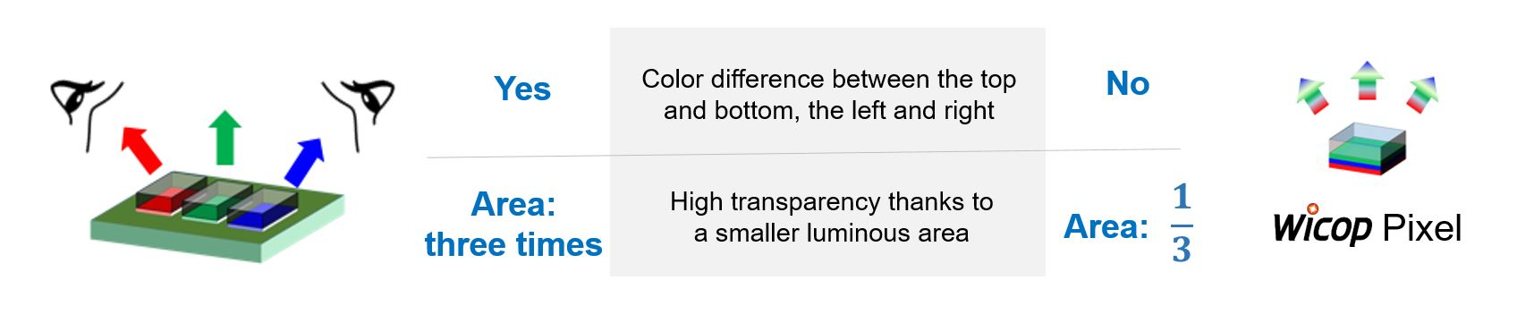« WICOP Pixel » repose sur la technologie WICOP, qui ne nécessite ni microcâblage, ni mise en boîtier, ni lentille. Il s'agit de la première technologie RGB à puce unique au monde, qui empile verticalement trois microLED RGB. Cette structure à empilement permet de fabriquer des puces ultracompactes et de diviser les procédés de montage et de fabrication par trois, ce qui apporte une compétitivité irremplaçable sur le marché des écrans d'une valeur de 100 billions KRW. La structure à empilement de WICOP Pixel réduit également la surface lumineuse à un tiers, ce qui permet de renforcer la transparence jusqu'à plus de 90 %. Tout ceci fait de WICOP Pixel une technologie essentielle au futur monde du métavers faisant notamment appel à la RA et à la RV.