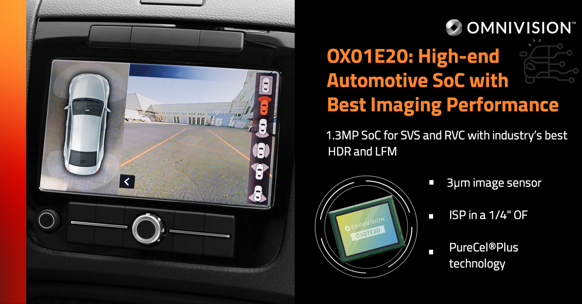 SANTA CLARA, Calif.--(BUSINESS WIRE)--OMNIVISION, a leading global developer of semiconductor solutions, including advanced digital imaging, analog, and touch & display technology, announced today its new 1.3-megapixel (MP) OX01E20 system-on-chip (SoC) for automotive 360-degree surround view systems (SVS) and rear-view cameras (RVC). The OX01E20 brings top-of-the-line LED flicker mitigation (LFM) and 140db high dynamic range (HDR) capabilities to the OMNIVISION product portfolio of automotive single-chip image sensor and signal processor solutions.