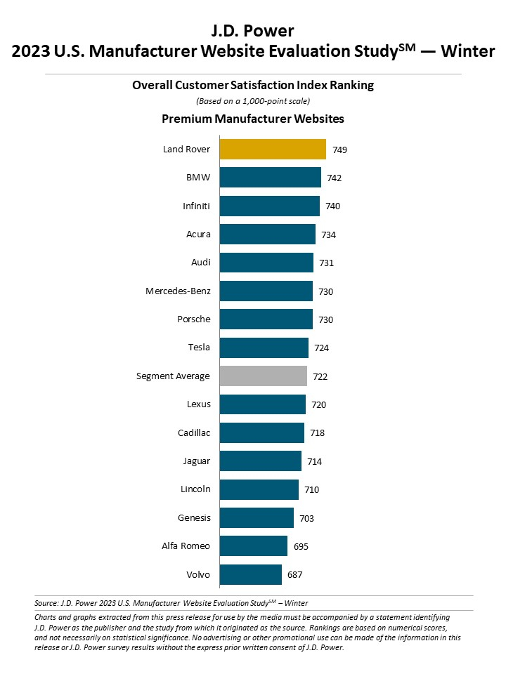 TROY, Mich.--(BUSINESS WIRE)--As auto manufacturer websites become increasingly important to shoppers, overall satisfaction for manufacturer websites is also growing, up 11 points (on a 1,000-point scale) for the premium segment to 722 and 3 points for the mass market segment to 708 according to the J.D. Power 2023 U.S. Manufacturer Website Evaluation StudySM —Winter, released today. When shoppers use certain tools, specifically the build and price, vehicle compare, 360° viewer and payment/lease calculator, the likelihood of the shopper to consider the brand increases by 11 percentage points.