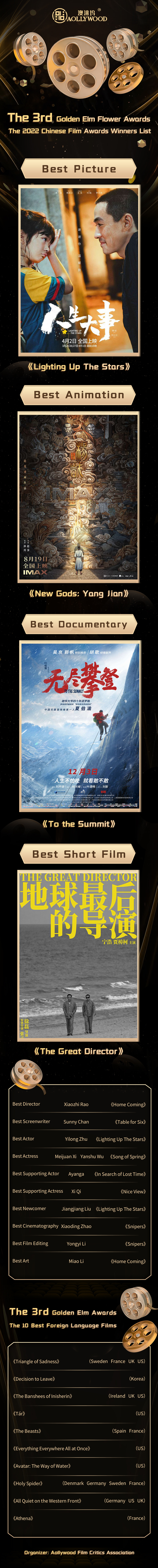In the selection of foreign language films, "Triangle of Sadness", "Decision to Leave", "Avatar: The Way of Water", "All Quiet on the Western Front", "Everything Everywhere All at Once", "The Banshees of Inisherin", "Tár", "The Beasts", "Holy Spider", "Athena" were awarded the 10 Best Foreign Language Films for the Golden Elm Flower Awards.
