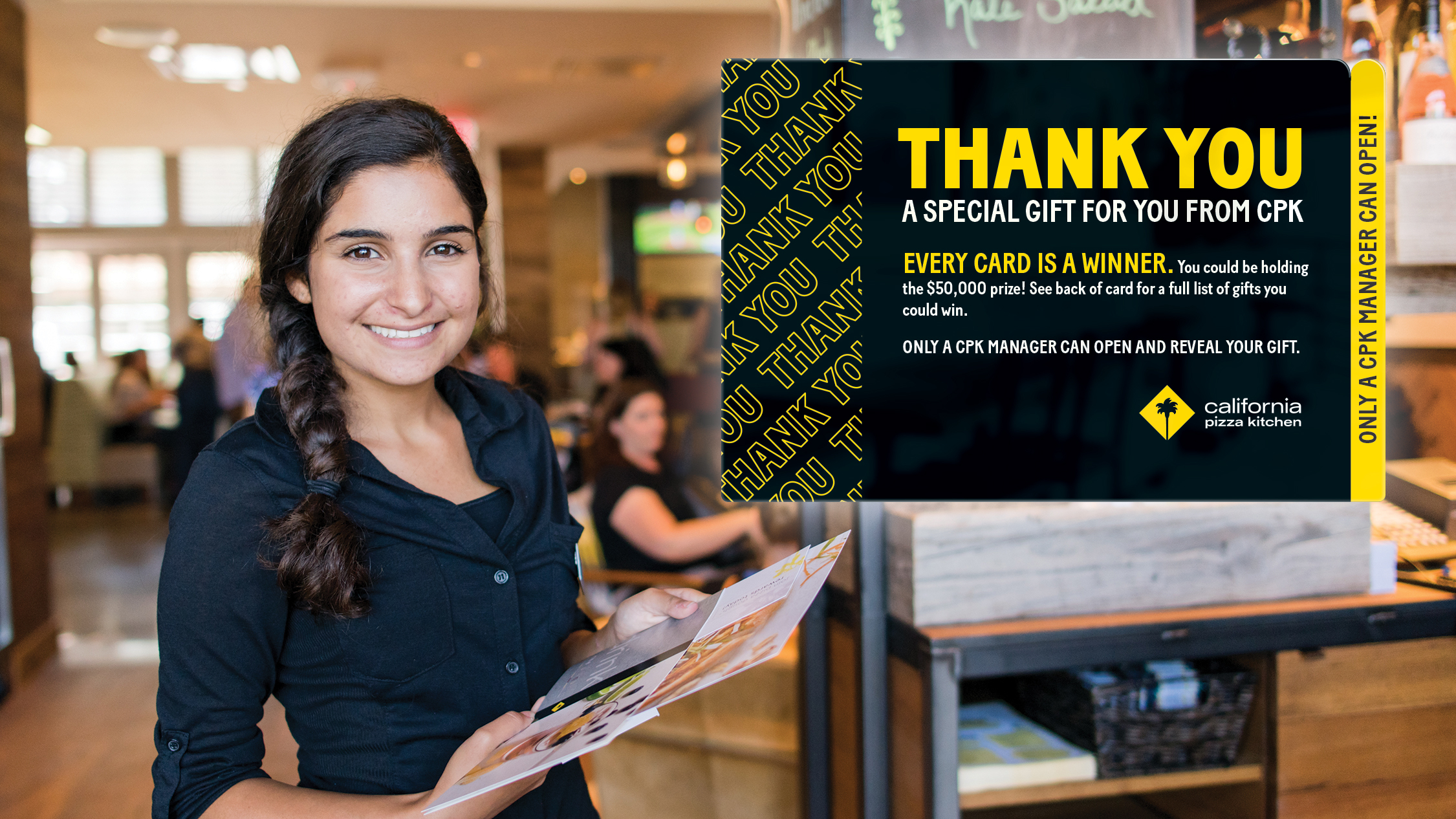 COSTA MESA, Calif.--(BUSINESS WIRE)--California Pizza Kitchen (CPK), the creators of the iconic Original BBQ Chicken Pizza, is relaunching its popular Thank You Card promotion that rewards every guest with prizes just for dining at the restaurant. Starting Monday, January 16th, CPK will hand out sealed Thank You Card envelopes to guests dining in or taking out at any location nationwide*. Each envelope contains a secret prize, redeemable on a future visit. Prizes range from discounts off a meal, free pizza for a year, a trip for two to California and cash prizes from $500 to $50,000.