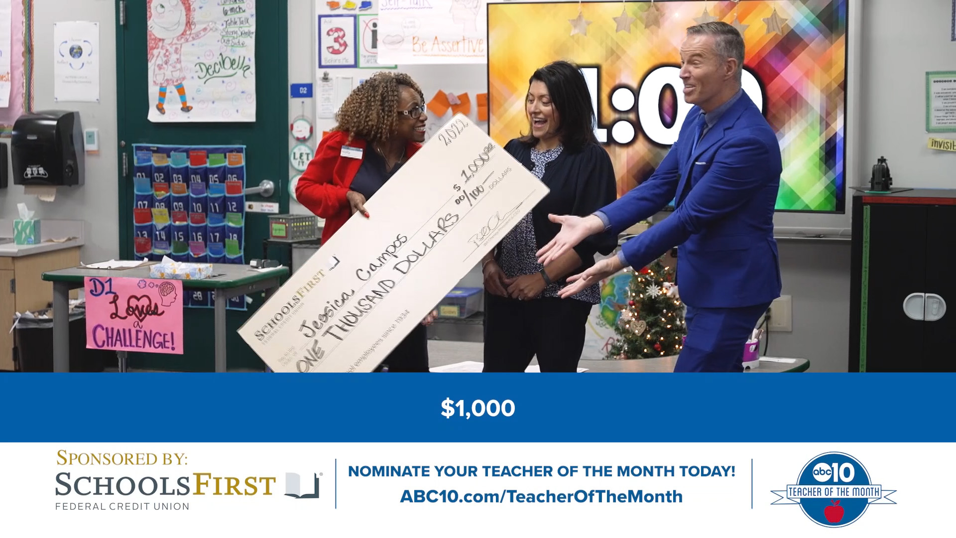 As part of being recognized as Teacher of the Month, Ms. Campos will receive $1,000 from SchoolsFirst Federal Credit Union and will be eligible for the title of Esquire IMAX ABC10’s Teacher of the Year award, including a $5,000 prize, which will be announced at a special awards program early next year.