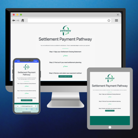 Enter Pathway – the leading digital solution for mass tort law firms post settlement. Pathway automates the distribution process by enabling claimants to receive their payout in three simple steps – signing their digital closing statement, reviewing their financial planning options right in the platform, and then selecting their payment method (options include a prepaid virtual Mastercard, PayPal, Zelle, Direct Deposit or traditional paper check).