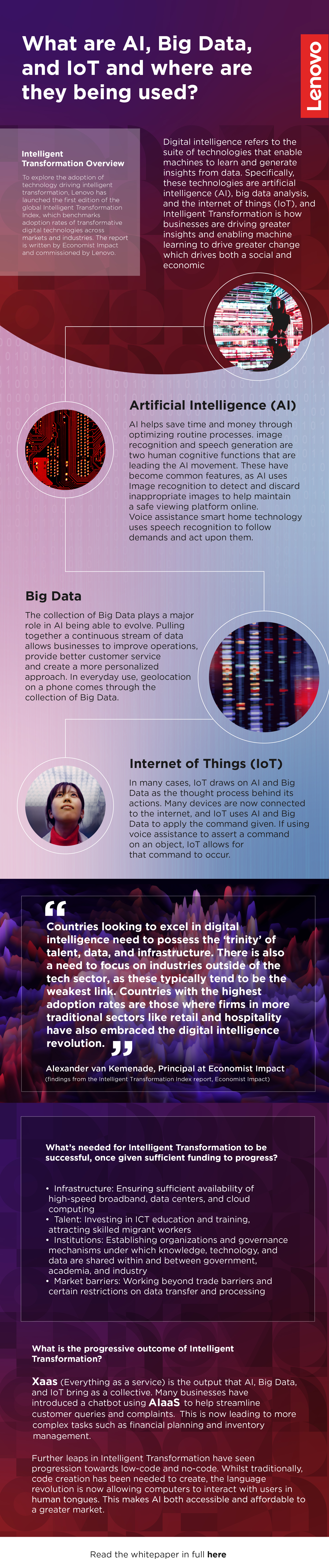 In tutte le realtà aziendali, la tecnologia sta trasformando ogni aspetto delle funzioni di un'organizzazione, ma sono tecnologie come i big data, l'intelligenza artificiale (AI) e l'internet delle cose (IoT) a guidare un nuovo paradigma di cambiamento - la trasformazione intelligente - per ottenere migliori risultati sociali ed economici.