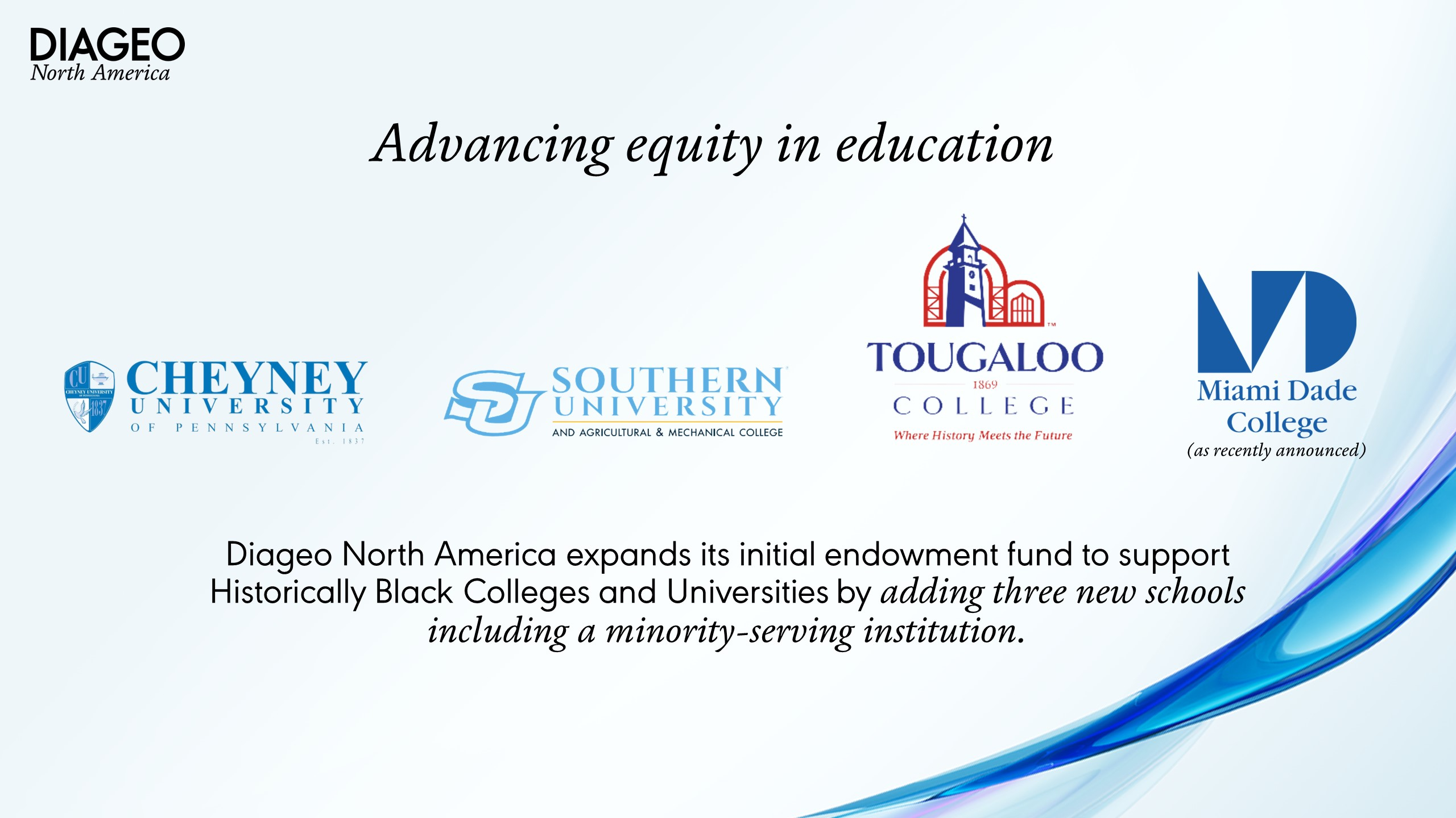 NEW YORK--(BUSINESS WIRE)--Diageo North America is providing an additional $1.75 million in endowments to support Historically Black Colleges and Universities (HBCUs) and Minority-Serving Institutions. The additional funding is an expansion of the company’s initial $10M in endowments granted to 25 HBCUs in 2021, as part of Diageo’s commitment to inclusion and diversity. This unique endowment and development program works to shape a more equitable society and address educational barriers in underrepresented communities across the U.S.