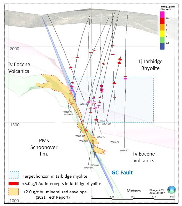 One core hole drilled in 2020 was angled SE to NW to test for the presence of NE trending vein zones within the Jarbidge rhyolite. Hole WG450 was drilled 190 meters NE of the Gravel Creek resource and intersected three high grade vein zones, carrying 1.52 meters at 4.07 g/t Au and 363 g/t Ag, 1.83 meters at 7.22 g/t Au and 334. 3 g/t Ag, and 0.3 meters at 37.1 g/t Au and 1,951 g/t Ag (see Table 2). The second intercept, as well as four smaller quartz-pyrite-marcasite vein zones, had strikes of N45-68E with dips from 65-90NW.