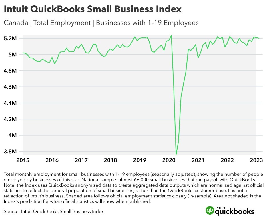 Au Canada, le rapport Intuit QuickBooks sur les petites entreprises indique le nombre de personnes employées par les petites entreprises de 1 à 19 personnes au cours du mois précédent et l’évolution de ce nombre depuis le mois d’avant. Ces données fondées sur un échantillon de presque 66 000 entreprises sont établies à l’échelle nationale, régionale et sectorielle. En règle générale, le rapport est publié plusieurs jours avant la parution de l’Enquête sur la population active de Statistique Canada.