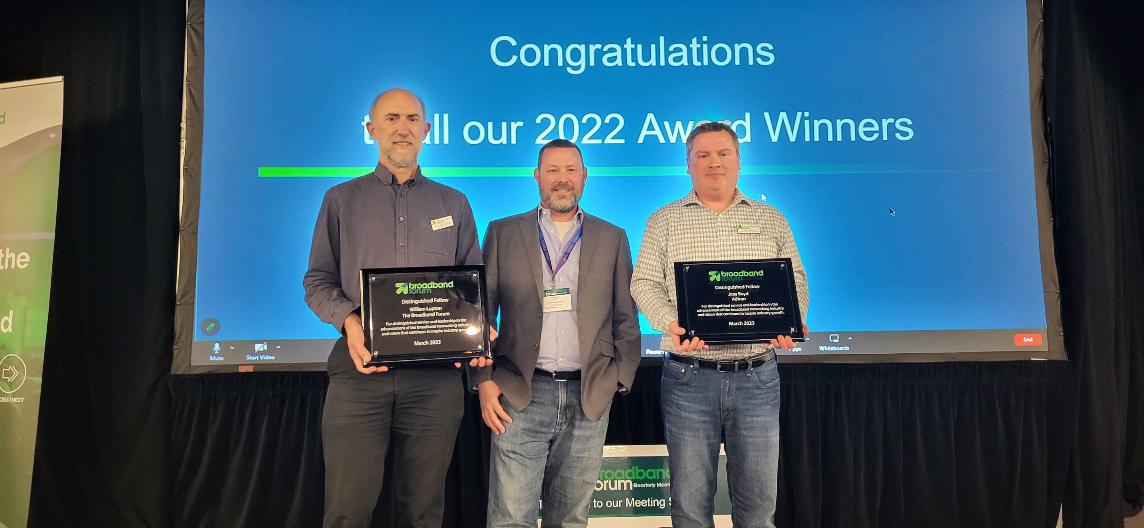 The 2023 Distinguished Fellow award was bestowed upon Joey Boyd, Adtran, and William Lupton, Broadband Forum. This award is given to those who are committed to delivering a distinguished service and show leadership in the advancement of the broadband networking industry, inspiring industry growth.