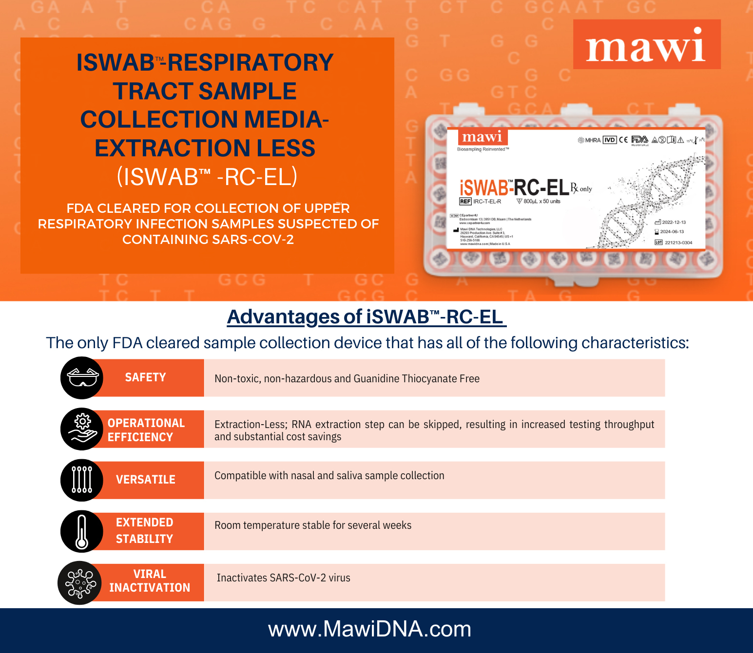 PLEASANTON, Calif.--(BUSINESS WIRE)--Mawi DNA Technologies (Mawi DNA), een biotechnologiebedrijf dat zich richt op de ontwikkeling en het ontwerp van innovatieve technologieën voor biosampling, kondigt aan dat de Amerikaanse Food and Drug Administration (FDA) 510(k)-goedkeuring heeft verleend voor de iSWAB-Respiratory Tract Sample Collection Media-Extraction Less™ (iSWAB-RC-EL) van het bedrijf. Het iSWAB-RC-EL-afnameapparaat is bedoeld voor de stabilisatie en inactivatie van biomonsters van de bovenste luchtwegen en het speeksel van mensen waarvan vermoed wordt dat ze SARS-CoV-2 bevatten, en kan worden gebruikt voor afname, transport en opslag bij kamertemperatuur. In het iSWAB-RC-EL-afnameapparaat afgenomen monsters zijn geschikt voor gebruik met legaal in de handel verkrijgbare moleculaire diagnostische tests.