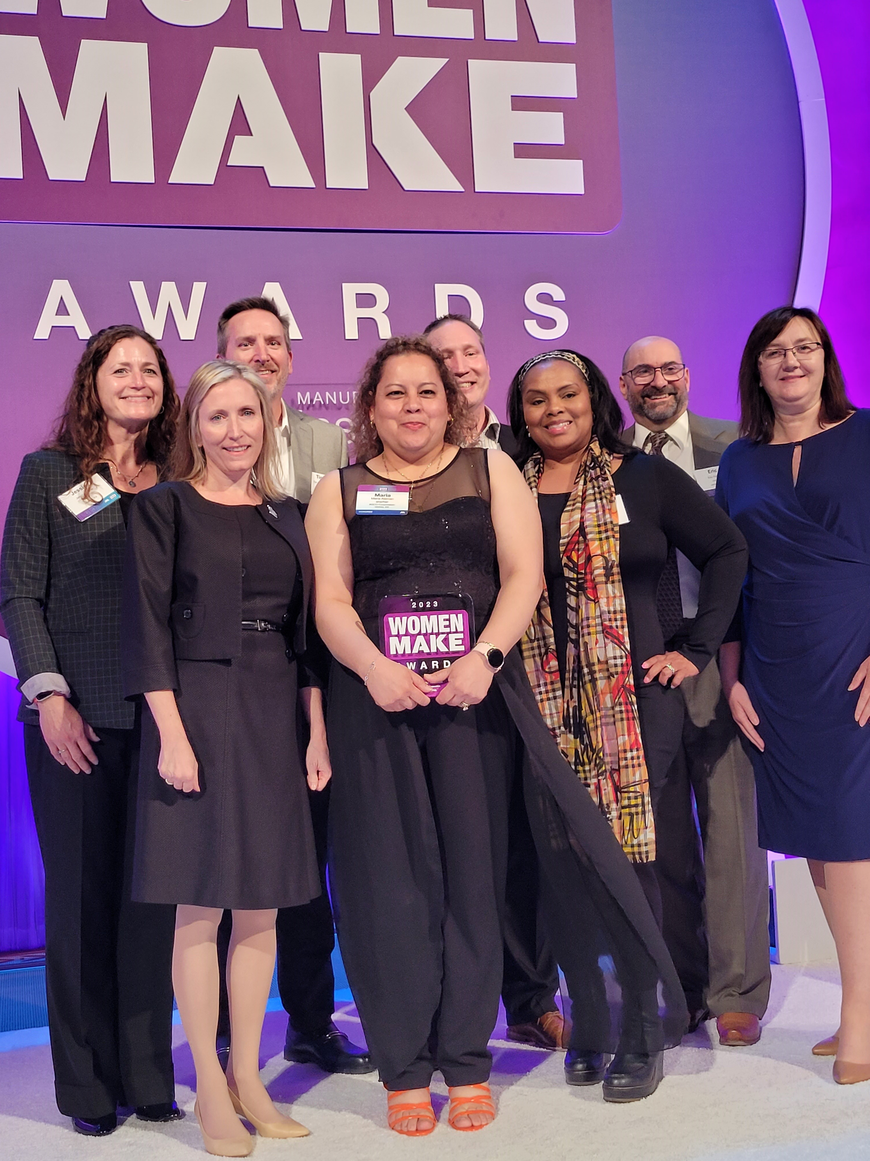 (L-R) Jessica Stone, Director of Supply Chain in Hesston, KS; Rachel Giannini, VP of Communications, Chief Communications Officer; Tim Millwood, SVP, Chief Supply Chain Officer; Maria Aleman, Production Supervisor; Russ Haug, Senior Manager of Operations; Ivory Harris, SVP, Chief Human Resources Officer; Eric Fisher, VP Manufacturing, NA; Julie Reese, Corporate Communications Director pose together at the 2023 Women Make Awards to celebrate award winners in Washington, D.C. on April 20, 2023. (Photo: Business Wire)