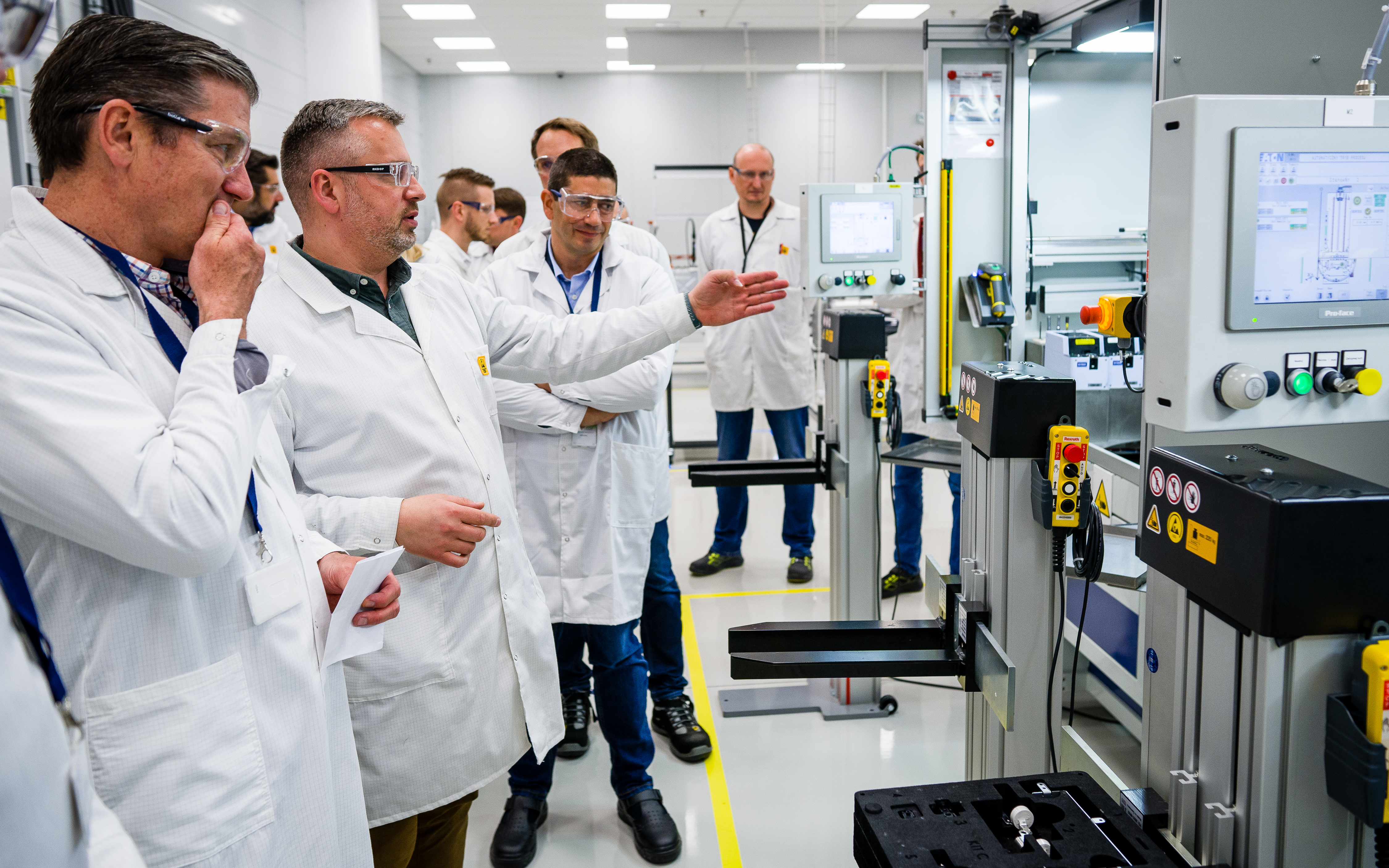 Eaton leaders, including Pete Denk, president, Vehicle Group, Eaton (left), Krzysztof Kaszkur, manufacturing manager, eMobility, Eaton (center), and Benito Dominguez, director, Operations, eMobility, Eaton (right), tour the new eMobility manufacturing line at the Vehicle Group’s Tczew, Poland, facility. (Photo: Business Wire)