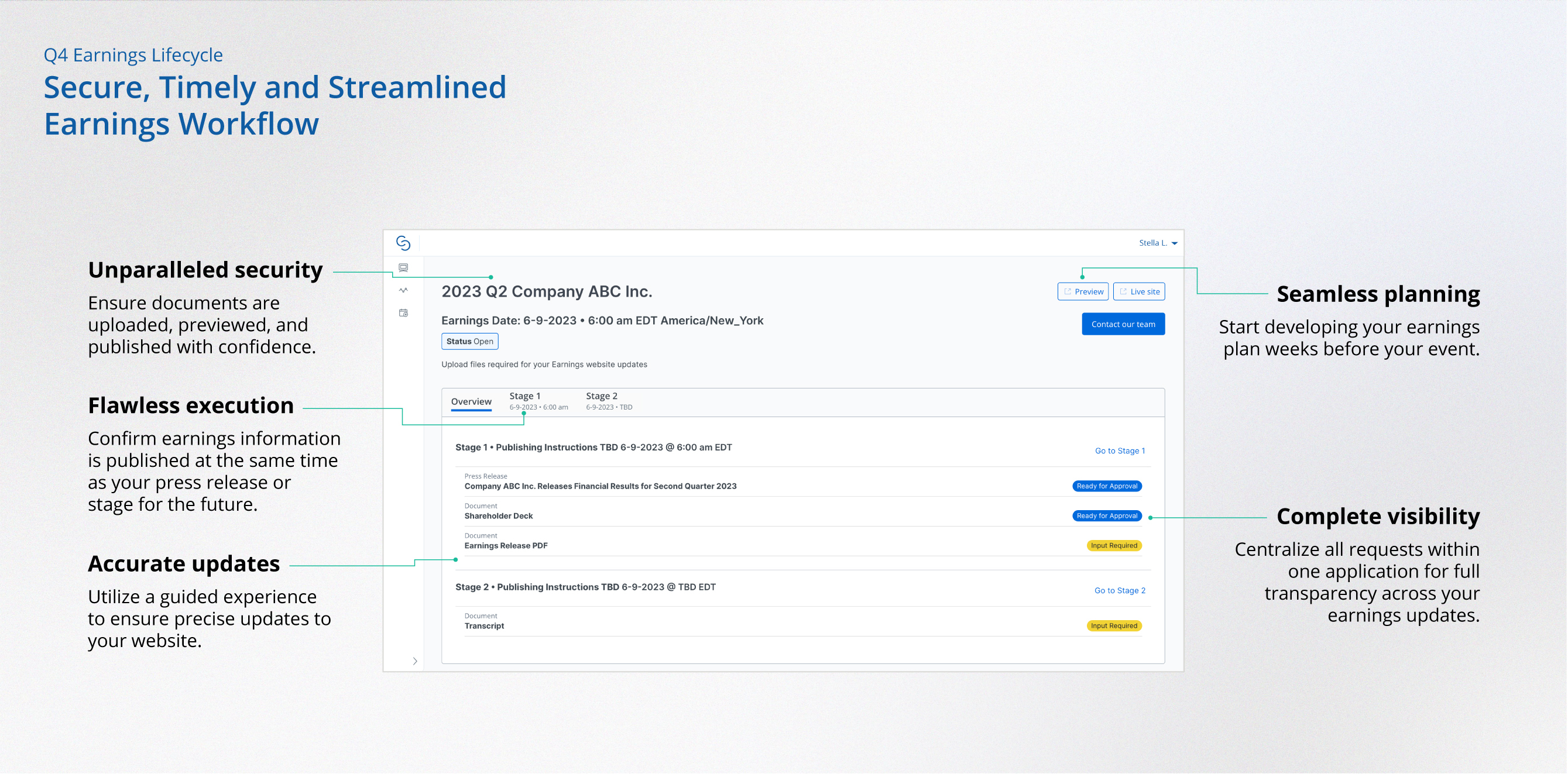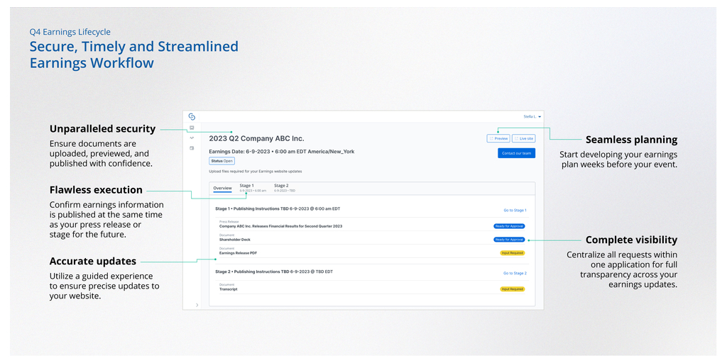 Earnings Lifecycle hilft Investor Relations Officers („IROs“) dabei, zeitlich abgestimmte und präzise gewinnbezogene Website-Aktualisierungen in einer cybersicheren Umgebung vorzunehmen. Dank dieser einzigartigen Sicherheit können IROs ohne Sicherheitsbedenken Dokumente hochladen, in der Vorschau öffnen und schließlich veröffentlichen. Von Website-Inhalten über das Timing der Pressemitteilungen bis hin zur Bekanntgabe aller wichtigen Meilensteine zum richtigen Zeitpunkt können IROs ihre Ertragssituation mit der sichersten und transparentesten Kommunikationsstrategie vereinfachen und zentralisieren. In den kommenden Quartalen wird diese neue Anwendung den Kunden zur Verfügung gestellt und kontinuierlich verbessert.