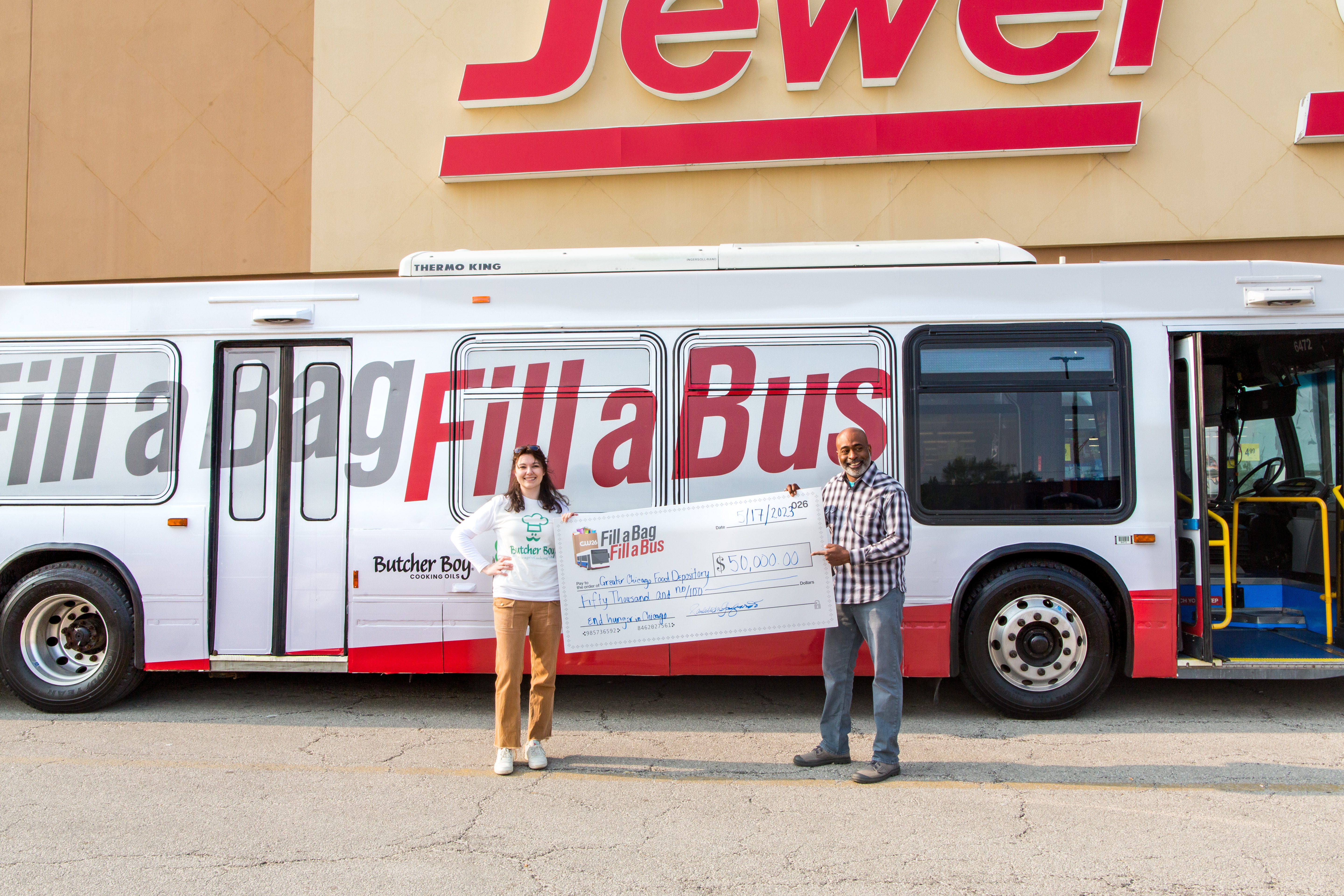 Sponsored by CW26, the Greater Chicago Food Depository, Chicago Transit Authority, Jewel-Osco and Columbus Vegetable Oils, Fill a Bag, Fill a Bus took place at Jewel-Osco stores in Oak Lawn and River Forest from May 17-18. In addition to the check presentation, CVO contributed Butcher Boy swag for the bags of food items that were loaded onto CTA buses and delivered to the Greater Chicago Food Depository.