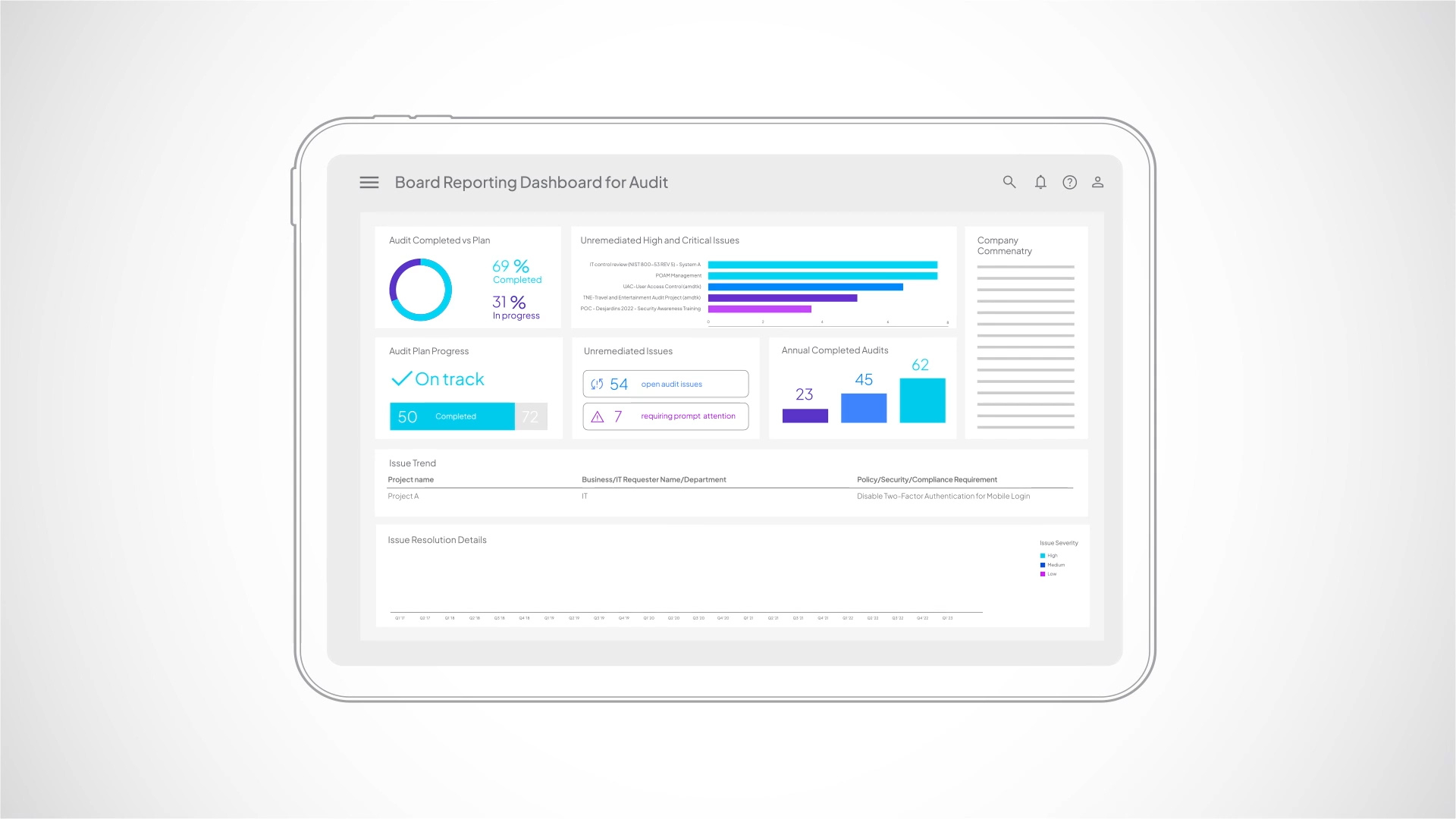 I dashboard standardizzati permettono ai professionisti dell'audit di fornire ai consigli di amministrazione una reportistica accurata e facilmente fruibile che aiuta a ottenere una miglior panoramica su rischi e controlli