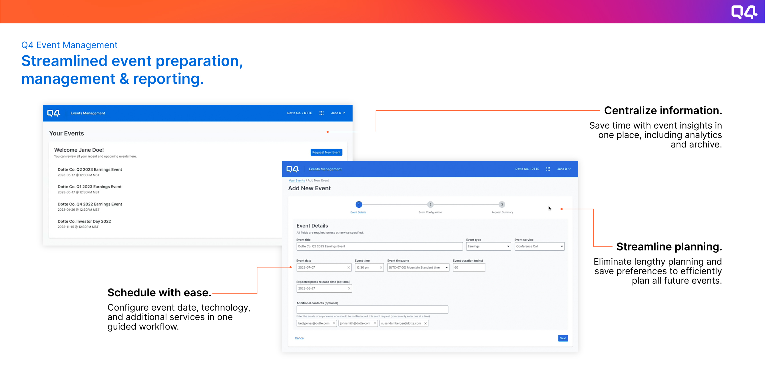 TORONTO--(BUSINESS WIRE)--Q4 Inc. (TSX: QFOR) (“Q4” o “la Società”), la principale piattaforma di accesso ai mercati dei capitali, è entusiasta di presentare la Event Management App alla Q4 Platform, che consentirà ai clienti di provare l'esperienza in forma semplificata della preparazione e gestione degli eventi e della reportistica sui ricavi, le giornate per gli investitori e altri eventi importanti sul proprio calendario dedicato alle relazioni con gli investitori (IR).