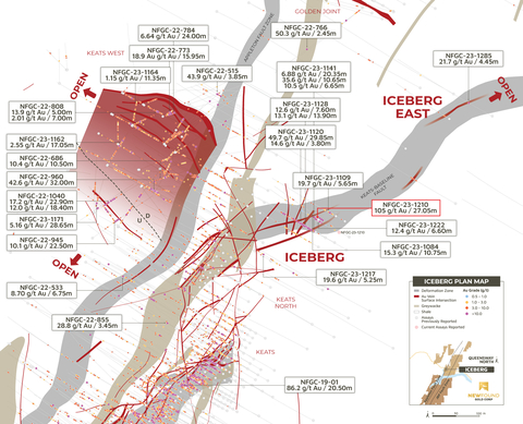 VANCOUVER, British Columbia--(BUSINESS WIRE)--New Found Gold Corp. (“New Found” or the “Company”) (TSX-V: NFG, NYSE-A: NFGC) is pleased to announce the results from one diamond drill hole that was completed as part of a follow-up drill program at the new Iceberg discovery, a high-grade zone located 300m northeast of Keats Main along the highly prospective Appleton Fault Zone (“AFZ”). New Found’s 100%-owned Queensway project comprises a 1,662 km2 area, accessible via the Trans-Canada Highway, 15km west of Gander, Newfoundland and Labrador.
